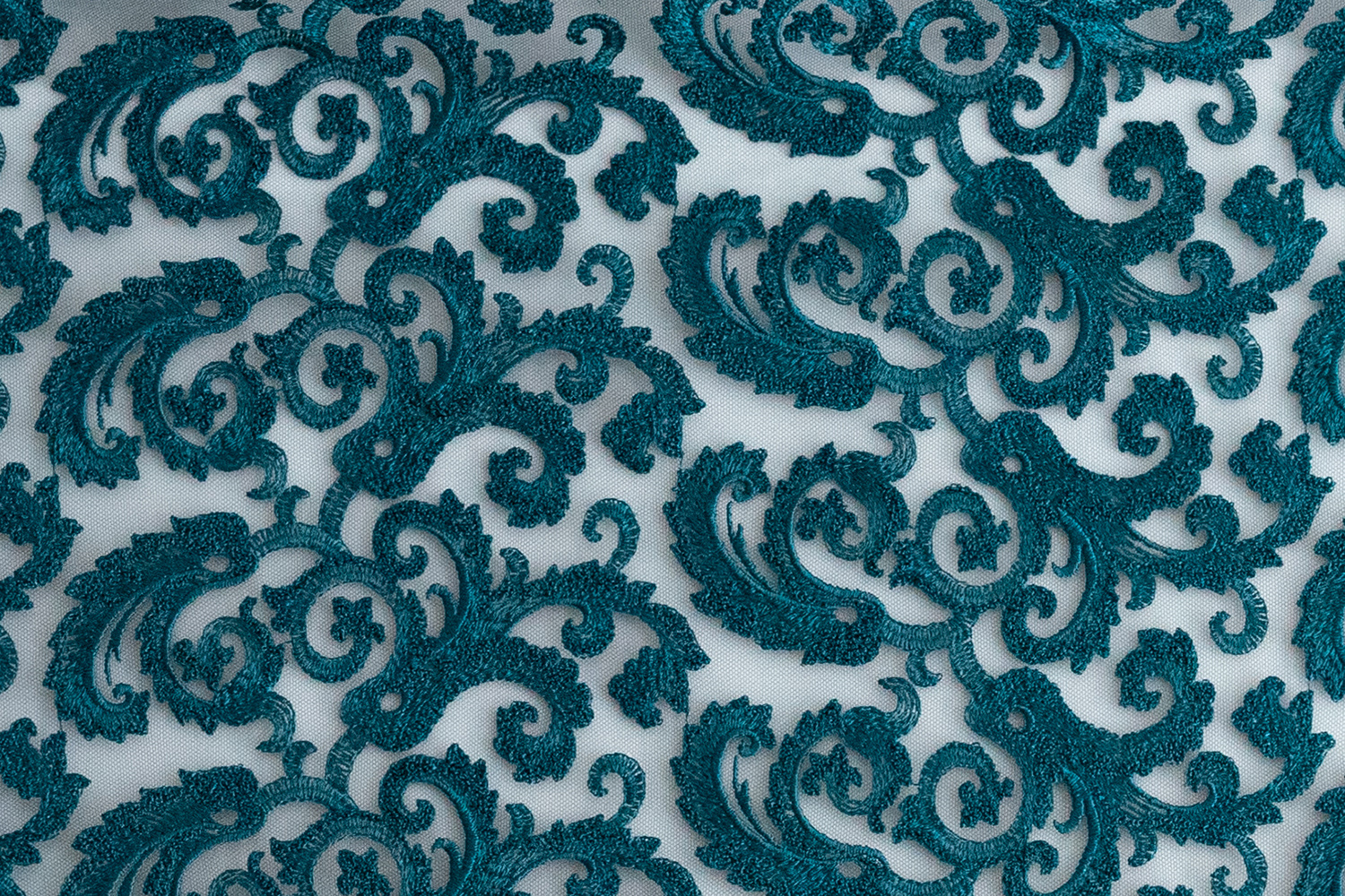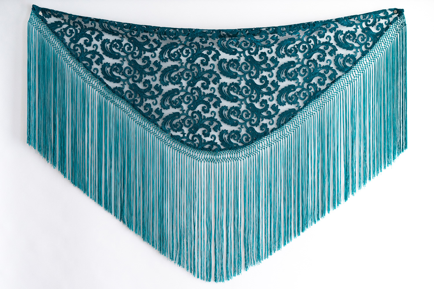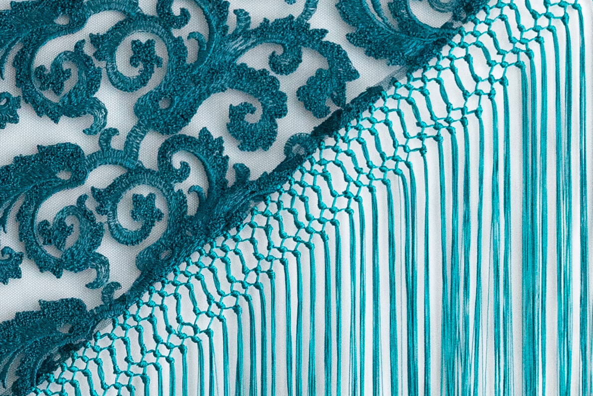 Tul bordado y seda. Medidas de tela 121 x 46 cm. Longitud de fleco 40 cm.