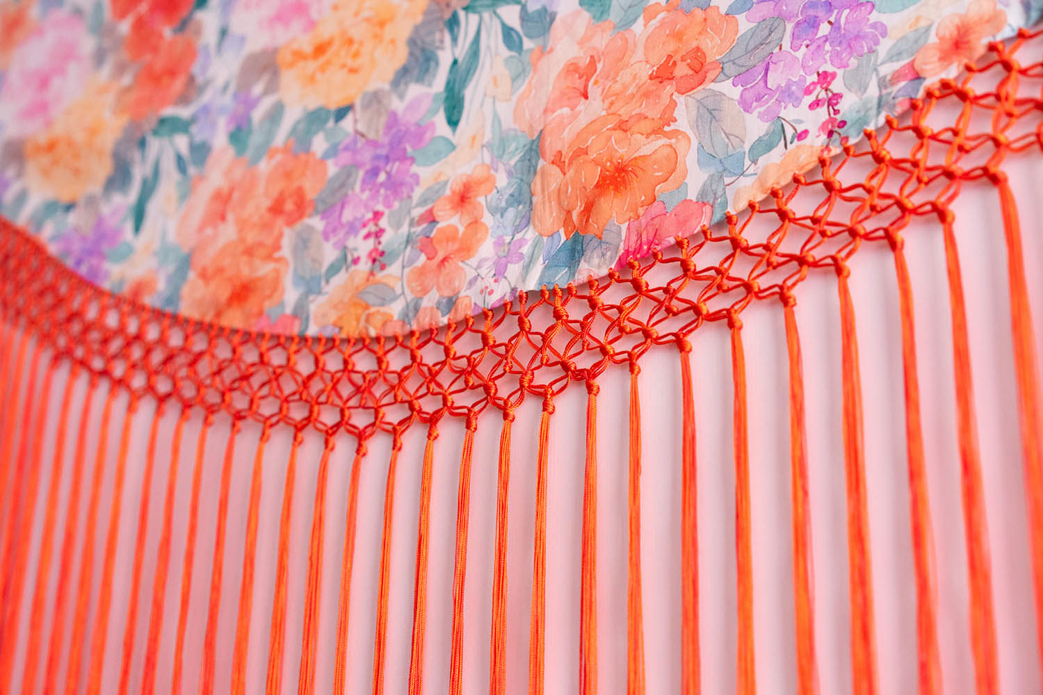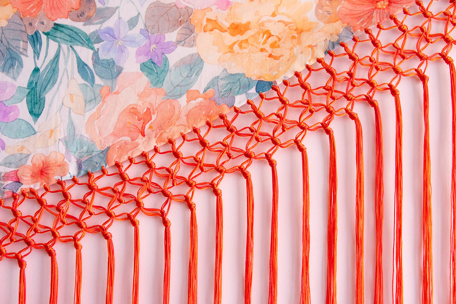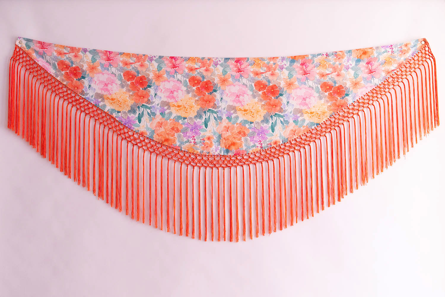 Algodón fino y seda. Medidas de tela 127 x 30 cm. Longitud de fleco 27 cm.
