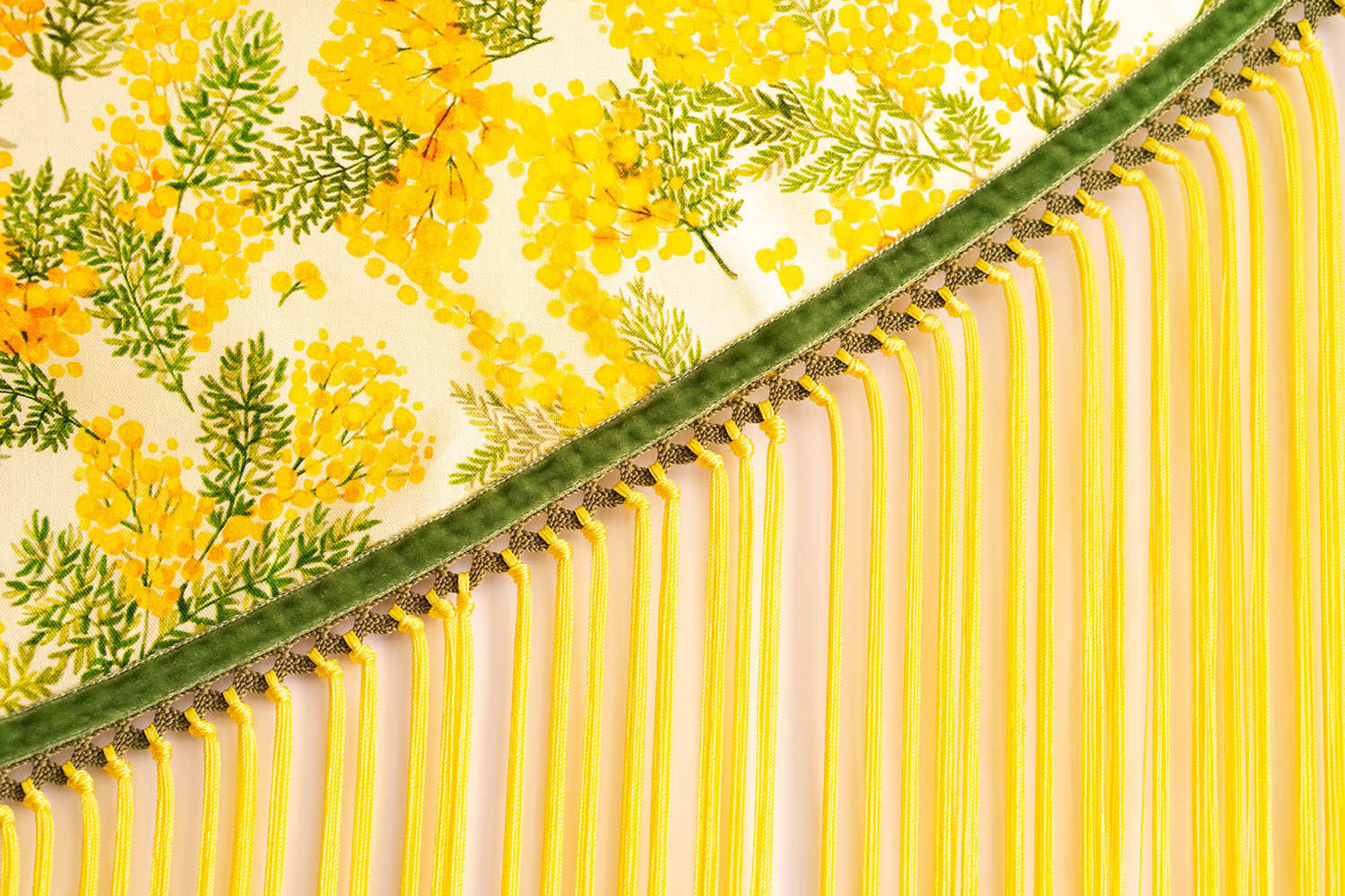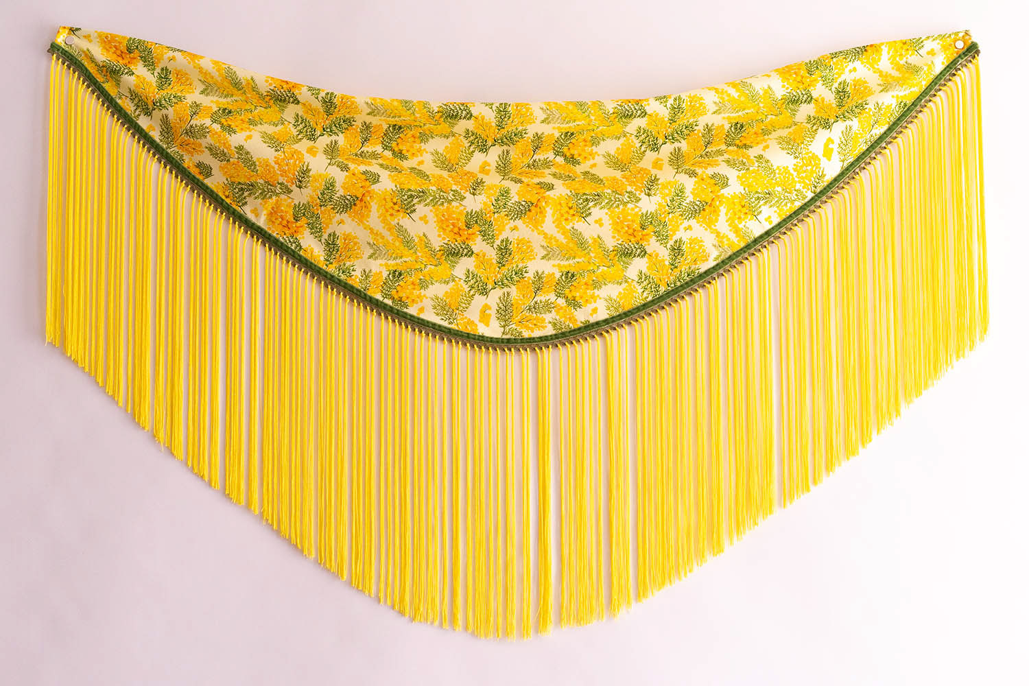 Algodón, seda y pasamanería de terciopelo y algodón. Medidas de tela 105 x 36 cm. Longitud de fleco 33 cm.