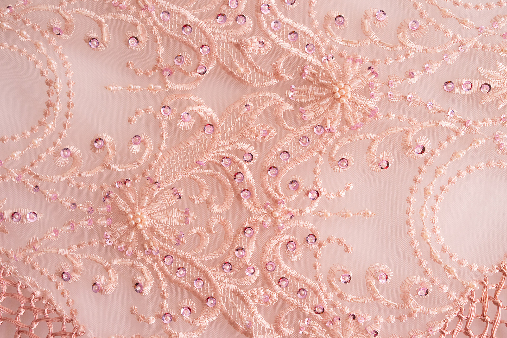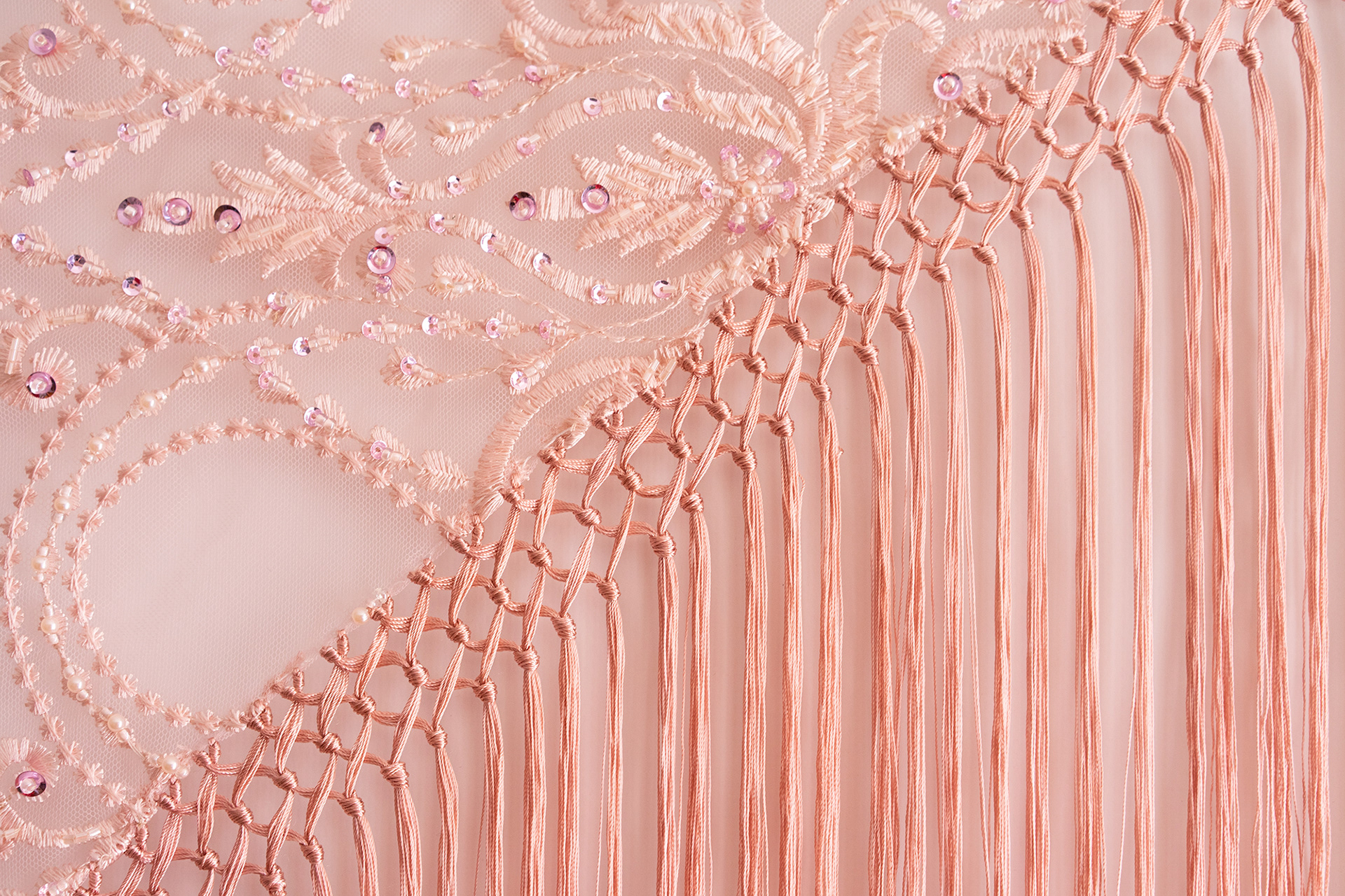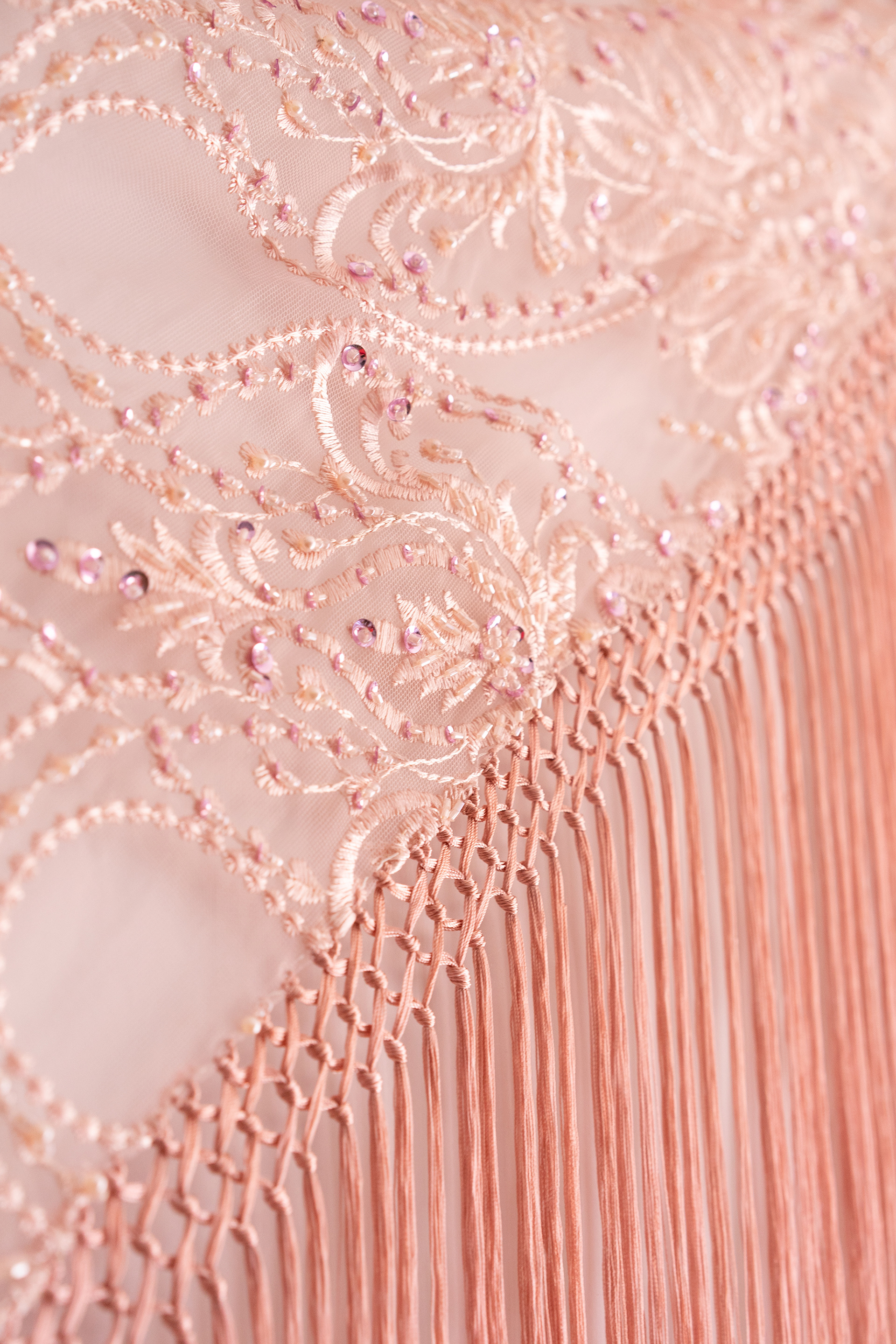 Tul bordado con pedrería y seda. Medidas de tela 130 x 51 cm. Longitud de fleco 29 cm.