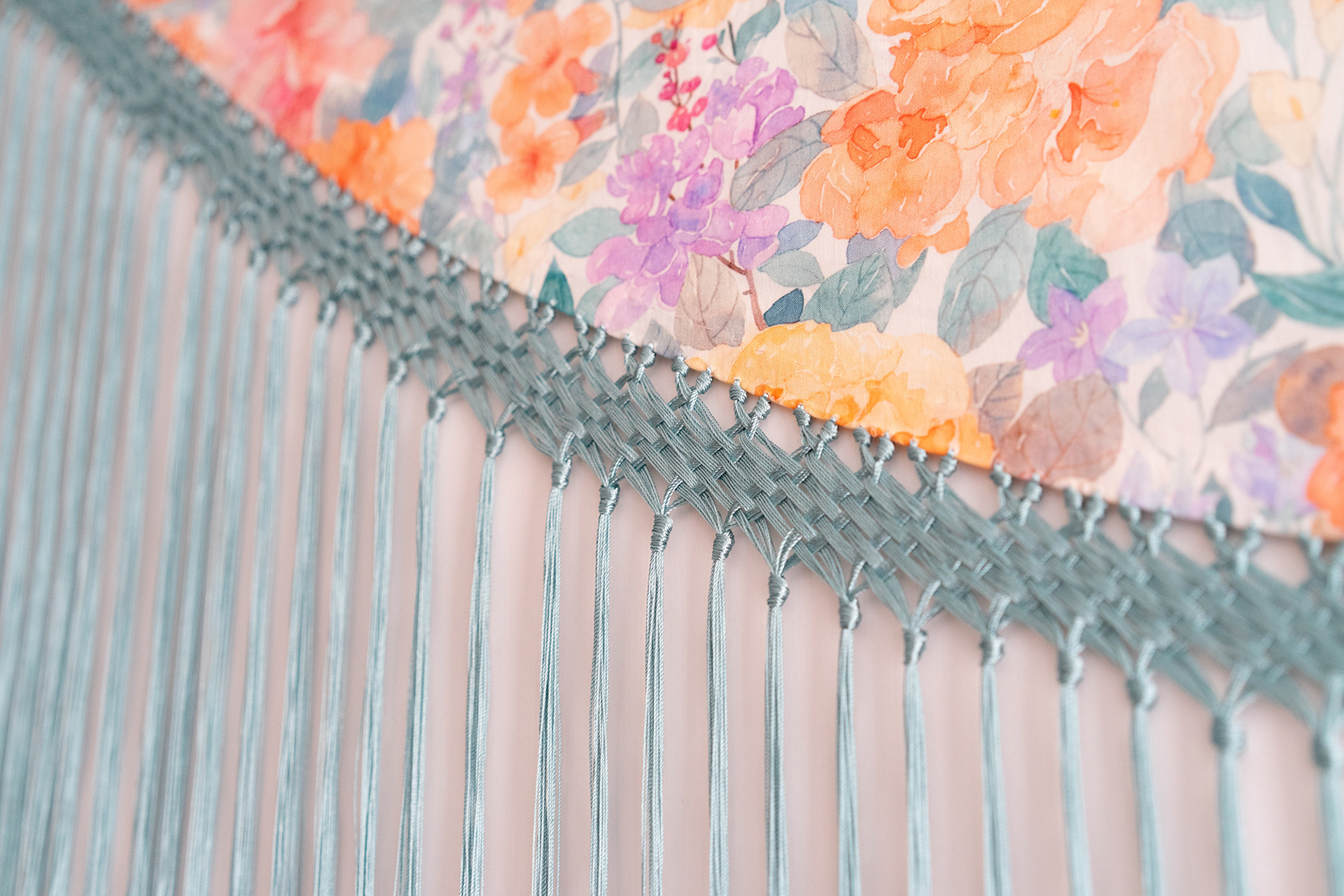 Algodón fino y seda. Medidas de tela 127 x 30 cm. Longitud de fleco 27 cm.