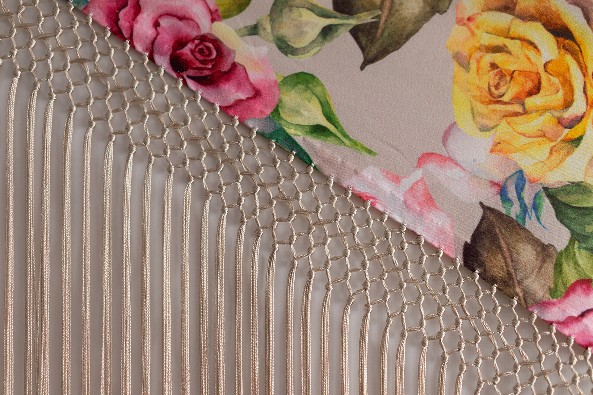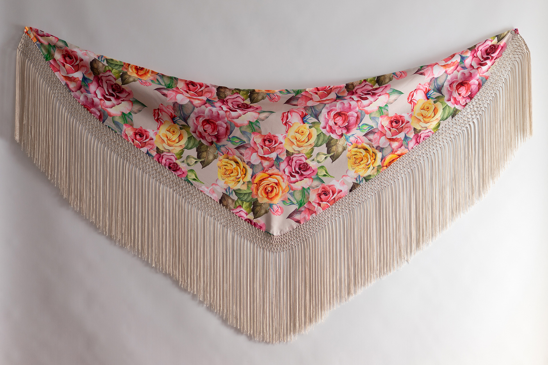 Algodón y seda. Medidas de tela 137 x 43 cm. Longitud de fleco 27 cm.