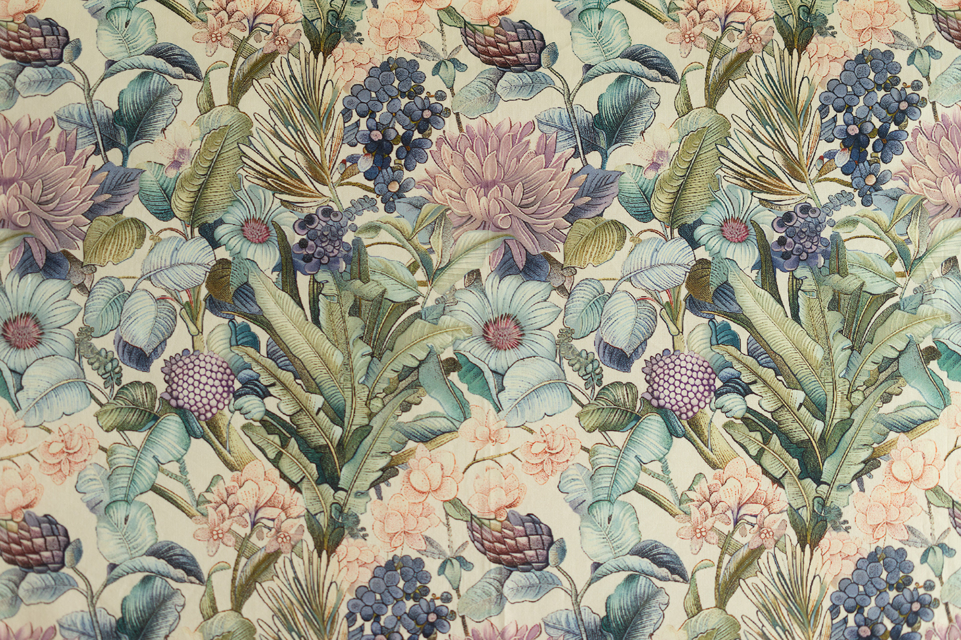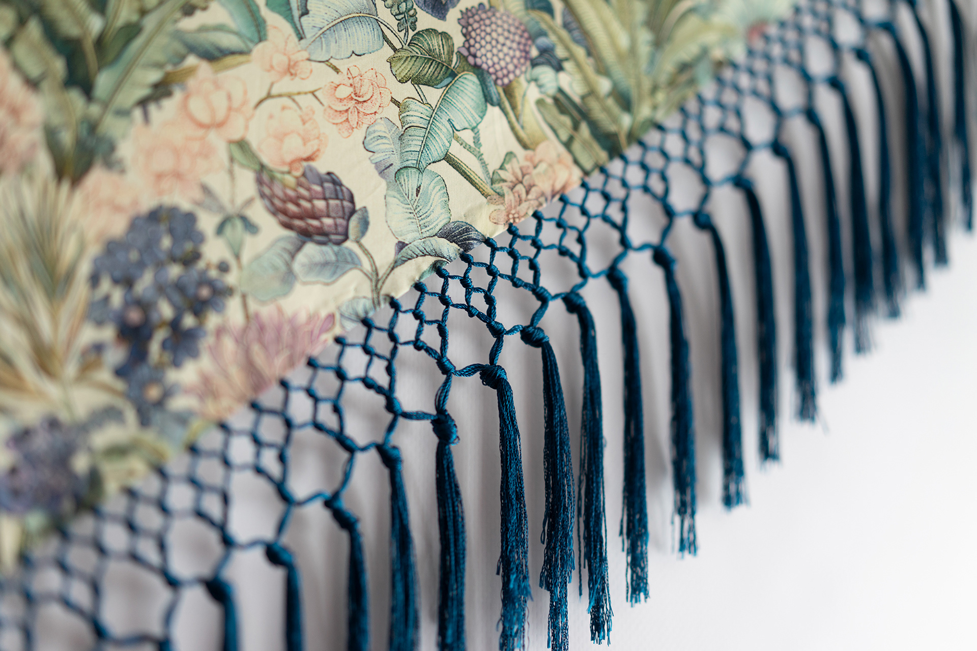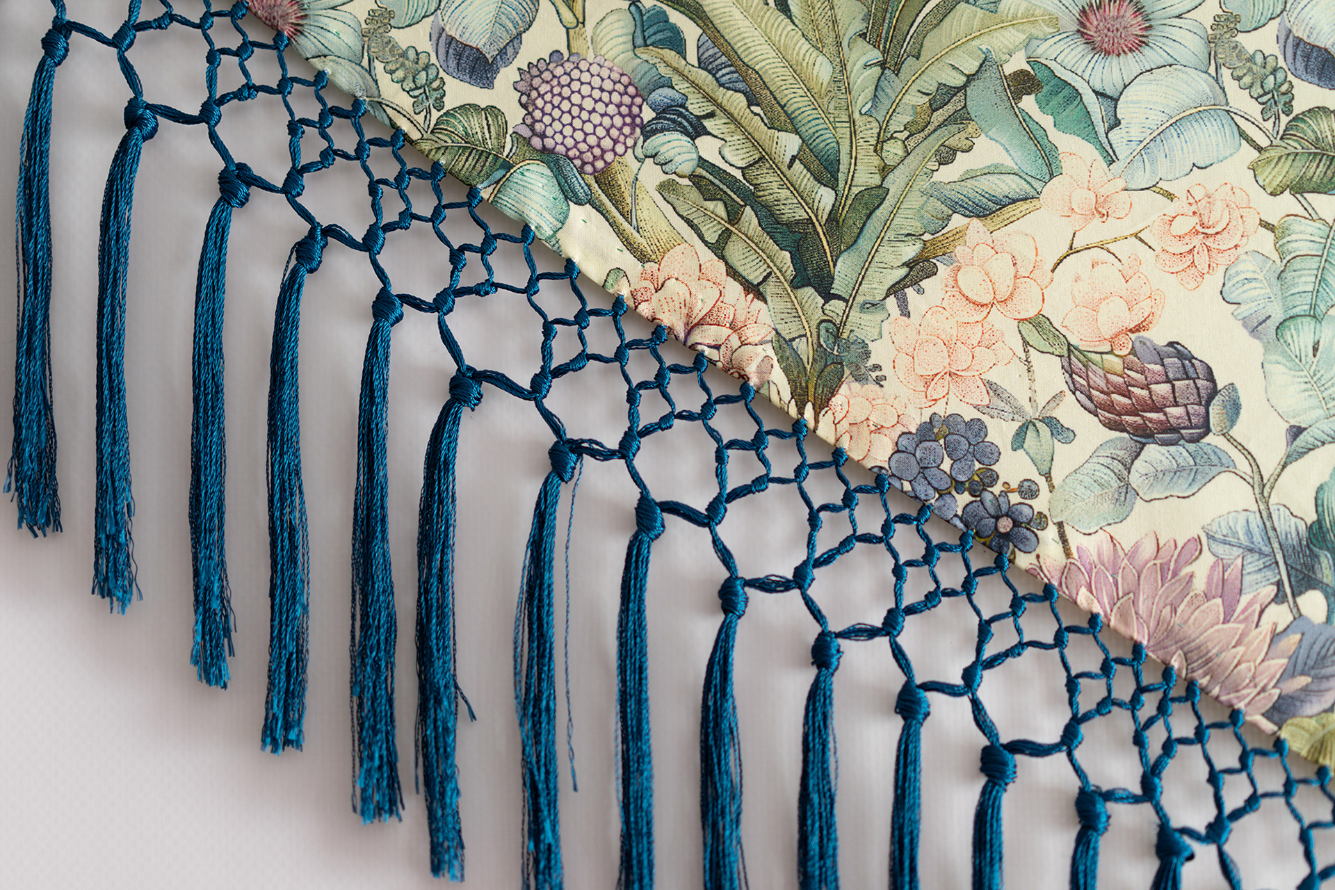 Algodón y seda. Medidas de tela 128 x 47 cm. Longitud de fleco borlón 16 cm.